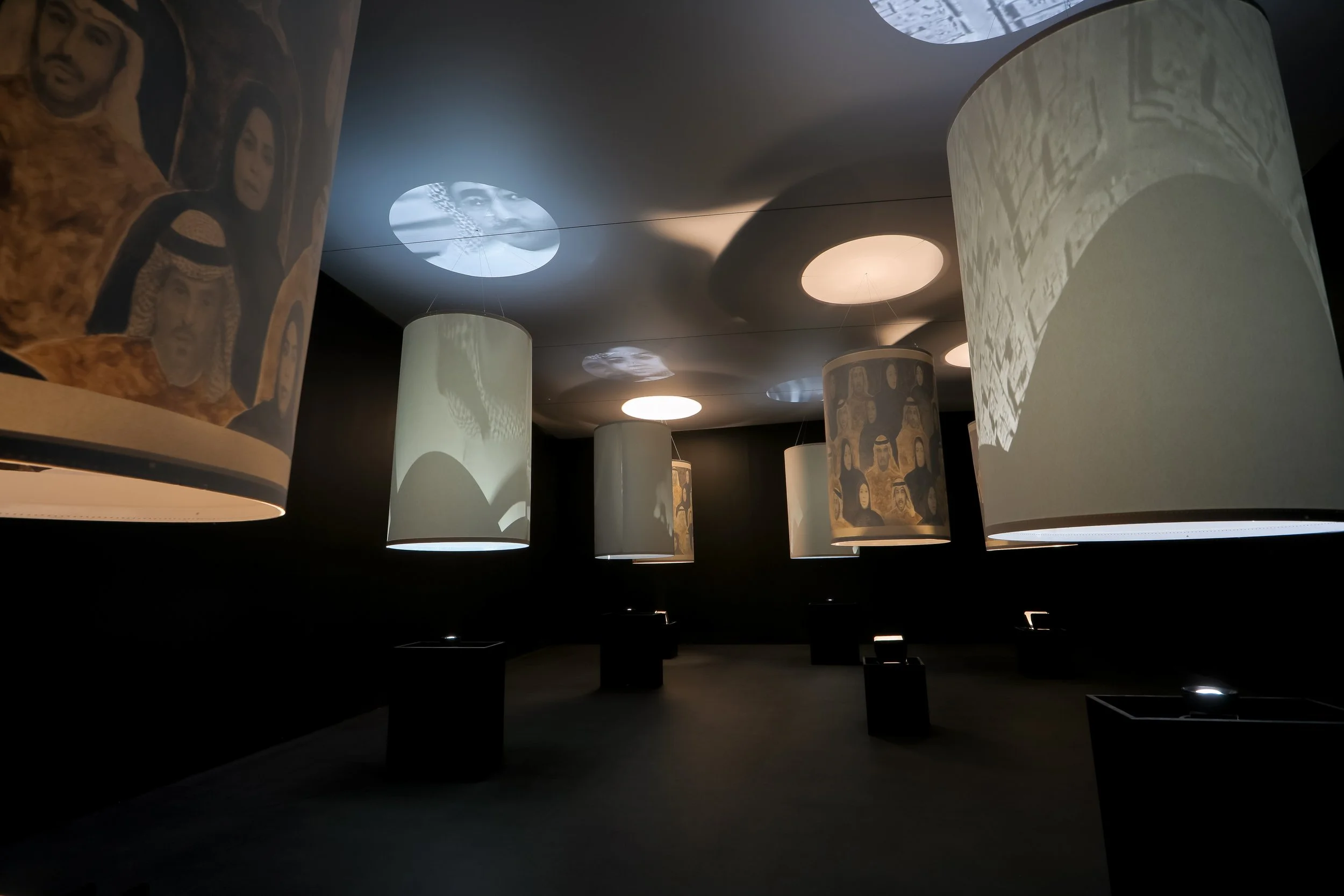 The work is composed of eight cylindrical structures, crafted from watercolour paper. These act as canvases for a series of intricate, machine learning generated visual projections and paintings. The data for these visuals finds its origin in a carefully curated collection of moments from television programs and news media, with snapshots from Al Saleh's personal life experiences in 2021. The machine learning algorithm skilfully intertwines these layers of time, imbuing the resulting images with a soft, nostalgic quality that blurs the line between past and present. These projections, when cast onto the delicate medium of watercolour paper, serve as a compelling metaphor for the fragility and transience of human memory.